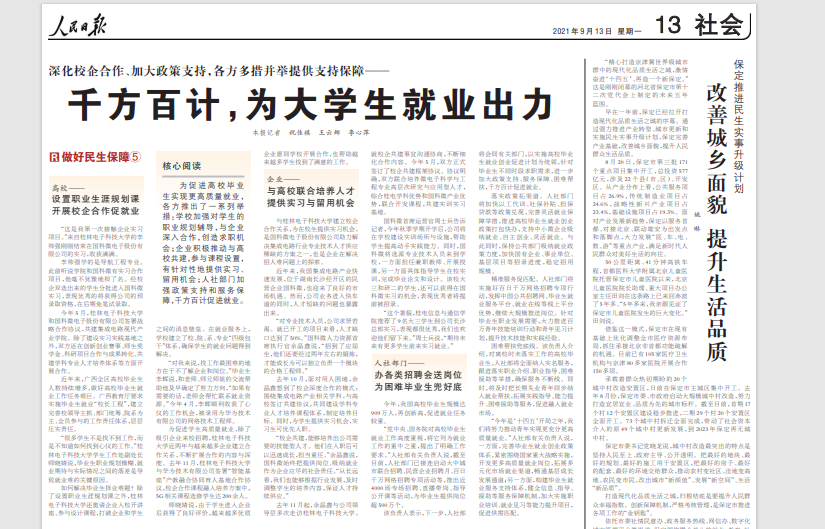 深化校企合作、加大政策支持,各方多措并舉提供支持保障—— 千方百計,為大學(xué)生就業(yè)出力 (做好民生保障⑤) 本報記者 祝佳祺 王云娜 李心萍 《人民日報》( 2021年09月13日 第 13版) 核心閱讀 為促進(jìn)高校畢業(yè)生實現(xiàn)更高質(zhì)量就業(yè),各方推出了一系列舉措:學(xué)校加強對學(xué)生的職業(yè)規(guī)劃輔導(dǎo),與企業(yè)深入合作,創(chuàng)造求職機會;企業(yè)積極推動與高校共建,參與課程設(shè)置,有針對性地提供實習(xí)、留用機會;人社部門加強政策支...